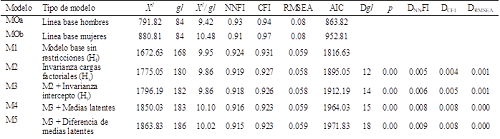 A continuación, se presentan tres nuevos modelos (M2, M3, M4), cada uno de ellos anidados en el anterior. El Modelo 2 (M2) muestra la equivalencia en la matriz de cargas factoriales (Hx: Lx (H) = Lx (M), donde (H) representa a los hombres y (M) a las mujeres. El modelo mostró adecuados índices de ajuste (RMSEA = .06; NNFI = .92; CFI = .93), siendo muy similares a los índices de ajuste obtenidos en el M1 (diferencia inferior entre índices de ajuste: (RMSEA = < .00; NNFI = < .00 y (CFI = < .00), lo que indica que no hay diferencias entre el modelo de línea base (M1) y el modelo con la restricción de las cargas factoriales (M2). Por tanto, no existen diferencias entre las cargas factoriales por género.