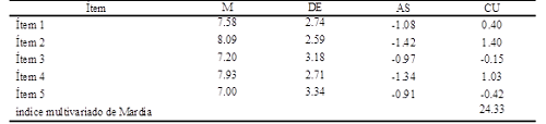 Tanto en la muestra de hombres como de mujeres todas las variables muestran valores de asimetría de ± 1.60 y ± 1.00 de curtosis, además, el índice multivariado de Mardia por debajo del valor 70 indica normalidad multivariada (Rodríguez y Ruiz, 2008).