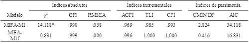 Análisis de invarianza factorial. Con el fin de obtener una prueba que presente las mejores propiedades para la conformación de los puntajes del cuestionario MIFA-M en varones y mujeres adolescentes se llevó a cabo un análisis de la invarianza factorial, tomando como base el mejor modelo obtenido en la muestra total (es decir, modelo MIFA-M1f). Posteriormente se calculó la fiabilidad, en ambas muestras a través del Alfa de Cronbach y el Coeficiente Omega (Revelle y Zinbarg, 2009).