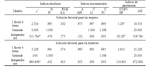 De acuerdo a los resultados de la Tabla 4 el análisis factorial confirmatorio de 4 ítems agrupados en un solo factor en la muestra de mujeres fue óptimo (GFI = .995; RMSEA = .032) y de acuerdo a las medidas de ajuste incremental y de parsimonia significativamente superior al modelo independiente y muy similar al modelo saturado.
