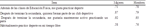 Los análisis factoriales confirmatorios realizados en la muestra total apoyan la estructura factorial de un solo factor. El factor así obtenido presenta en general saturaciones factoriales estandarizadas adecuadas, saturaciones que se corresponden con la estructura propuesta para el cuestionario por Moreno et al. (2007). De manera similar, en una muestra de 988 adolescentes españoles de 15-17 años, Moreno et al. (2007) encontraron adecuados resultados para un estructura unifactorial con los cinco ítems (CFI = .98; TLI = .96; RMSEA = .056; SRMR = .018). No obstante, en el presente estudio cuando se eliminaba el ítem 1 (“Me interesa el desarrollo de mi forma física, para no estar débil, mediante la práctica de deporte”) por su baja saturación, el modelo fue significativamente mejor.