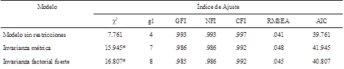Los índices de ajuste obtenidos (Tabla 6) permitieron aceptar la equivalencia de los modelos de medida básicos entre las dos muestras. El valor de Chi-cuadrado está por debajo al exigido para aceptar la hipótesis de invarianza, los índices GFI = .993, CFI = .997, RMSEA = .041 y AIC = 39.761 refuerzan esta conclusión lo que permite aceptar el modelo base de la invarianza (modelo sin restricciones).