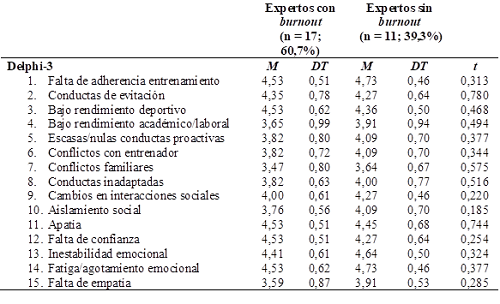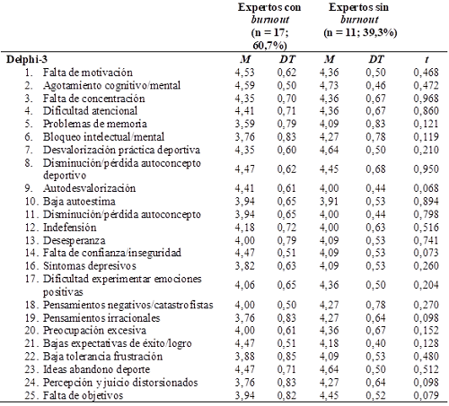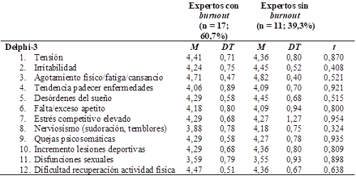En la Tabla 3 se observan los síntomas fisiológicos del síndrome referidos por los participantes. Las puntuaciones que indican un mayor acuerdo para los dos grupos de expertos fueron: tensión (M = 4,41, DT = 0,71 y M = 4,36, DT = 0,80, respectivamente), irritabilidad (M = 4,24, DT = 0,75 y M = 4,45, DT = 0,52), agotamiento físico/fatiga/cansancio (M = 4,71, DT = 0,47 y M = 4,82, DT = 0,40), desórdenes del sueño (M = 4,29, DT = 0,58 y M = 4,45, DT = 0,68) e incremento de lesiones deportivas (M = 4,29, DT = 0,68 y M = 4,36, DT = 0,80), no encontrándose diferencias estadísticamente significativas entre ambos grupos de expertos (p > 0,05).