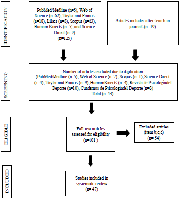 Exclusion criteria included (a) annals of and supplements on scientific events, (b) position statements, reviews, editorials, and instrument-validation articles, (c) articles based on samples composed of non-athlete students, coaches, referees, physicians, and entrepreneurs, (d) articles investigating mental toughness, beliefs, self-confidence, personality, and other related subjects, and (e) duplicated studies. Studies published in more than one of the assessed databases or that did not meet the default inclusion criteria were also excluded from the review (Figure 1). In total, 144 articles were selected (articles identified in the databases n = 125, articles found in journals in this scientific field n = 19). The second author of this article repeated the search ensure that no article suitable for inclusion in the review was missed. After applying the inclusion and exclusion criteria, the final sample comprised 47 publications. The procedures followed recommendations in the PRISMA protocol.