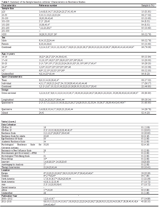 In total, 47 studies on athletes’ resilience were selected. Table 1 is based on a descriptive analysis and presents information about the selected studies according to the characteristics of the evaluated athletes.