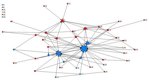 The nature of the study, which was addressed as qualitative, quantitative, and mixed, was also included in the analysis. New codes were inserted in the UCINET®6 software in order to conduct this analysis: "1" to codify the qualitative analysis, "2" the quantitative analysis, and "3" the mixed analysis (both qualitative and quantitative). The nature of the study was represented by the color of the Nodes: the blue Node corresponded to the qualitative studies, the red Node to the quantitative studies, and the yellow Node to the mixed studies.Procedimiento