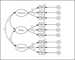Figure 1 shows standardized coefficients for the proposed model, with values ranging from .55 (Item 2) to .94 (Item 8). All values were statistically significant (p < .001). As estimated by the model, the relations among the three factors were .29 between technique and energy, .43 between energy and appearance, and .44 between technique and appearance.