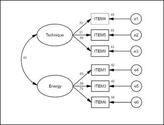 Figure 2 shows standardized coefficients for the proposed model, with values ranging from .65 (Item 1) to .81 (Item 5). All values were statistically significant (p < .001). As estimated by the model, the relation between both factors was .43 between technique and energy.