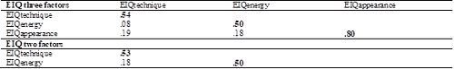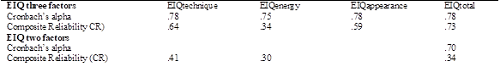 The Cronbach’s alphas of the two proposed EIQ models were acceptable, above .70. However, composite reliability was weak, not reaching the above .70 criterion (Hair et al., 2014), but most of these scores came close to .50, considered by Hernández Mendo, Morales Sánchez and Triguero Molido (2013) as a reliable construct indices. The AVE in most cases was higher than the .50, above the recommended value (Hair et al., 2014), indicating the construct explained more than half of the variance of all of its own indicators. In relation to discriminant validity, the results indicated the constructs were sufficiently independent among each other, given that in each factor the square of the factors correlations was below the AVE of the same (Hair et al., 2014).