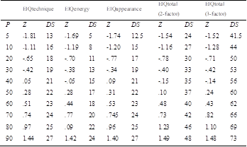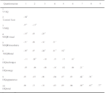 Among the correlations between the EIQ scales and the other imagery tests, it is worth noting the correlation between the EIQ technique and the Gordon Test (.26, p < .01). The EIQ energy subscale also correlated significantly -.16 with the visual MIQR (p < .05), but the correlation was small as shown in see Table 3. The percentiles are included in Table 4.