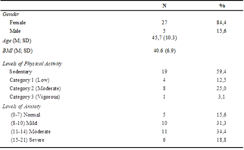 Participated of this study 32 patients (27 F and 5 M), age between 18-65 years old, with BMI varying between 27.05 and 56.69. Thirteen of them revealed being active while 19 revealed being sedentary. In addition, taking into account anxiety, 5 from 32 patients did not present anxiety and 27 presented some level of anxiety (for further details, please see table 1).