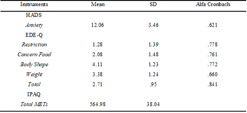 Table 2 shows the descriptive statistics of the values obtained by the subjects on the HADS, EDEQ and IPAQ. We also indicate the values of internal consistency, evaluated with the Cronbach's alpha coefficient. The values are all higher than the minimum of 0.60.
