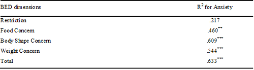The correlation coefficients between the dimensions of EDE-Q and anxiety are almost all significant (except restriction), positive and moderate. Thus, the higher the eating disorder values, the higher the anxiety levels (see table 3).