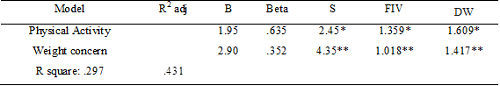 To check the factors that correlate with the anxiety levels, and to control the variables, we used a linear regression where the dimensions of EDE-Q, IPAQ were used as independent variables. The association is positive between anxiety (i.e., scale indicates that the higher the score, the higher the present anxiety) and the lack of PA (nominal variable 1-exercise, 2-no exercise). The same is true with concern about weight. Thus, the direction of variation in anxiety and lack of exercise is the same, so a positive association between the two variables means that the less exercise and the more worry about the body, the more anxiety. It was concluded that 29.7% of the anxiety variance is correlated with a model composed by PA and concern with weight. When R2 was adjusted, we found 43.1% of the anxiety variance correlated with the model PA and concern weight (see table 4).