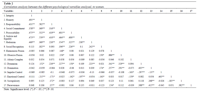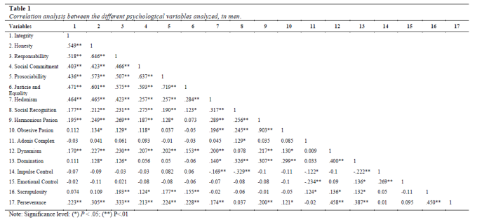 In men, the data obtained indicate that the Adonis Complex correlates in a positive way with Scrupulosity r(294)=.120, p<.05 and Social Recognition r(294)=.129, p<.05; and in a negatively way with Emotional Control r(294)=.234, p<.01 and Impulse Control r(294)=-.122,p<.05.