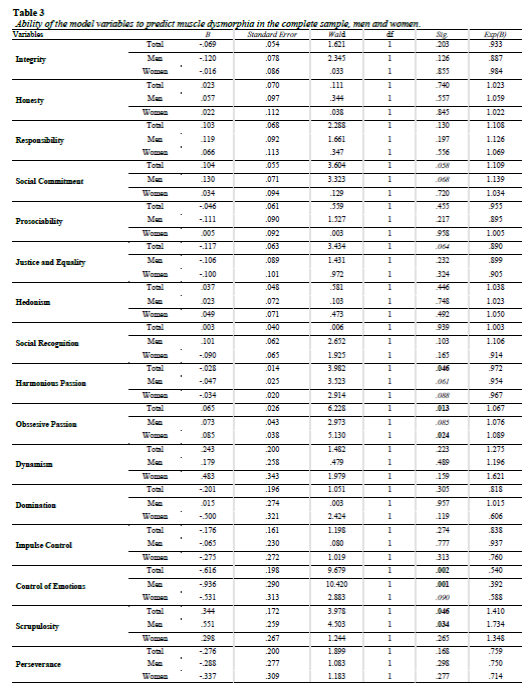 ABSTRACT: The Muscle Dysmorphia (MD) is a subcategory of body dysmorphic disorder in which subjects develop a pathological concern for their musculature. The population at risk that suffers from, or can develop MD, prevails in terms of age of appearance in subjects between 16 to 35 years; and it is more frequent in men. This study aimed to determine which variables of the personality, gender identity and passion (harmonious or obsessive) allow to predict MD in adolescents through the Adonis Complex (AC) Scale. A cross-sectional study was conducted on 506 subjects between 16 and 21 years (M=18.20; SD=1.72). The higher correlation was between AC and Emotional Control in men, and impulse control in women. Then a binary logistic regression analysis was performed and model yielded R2=.176 (X2=47.95 (16) <.001) and classified correctly in 88.5% of cases. Results of the analysis showed that harmonious passion (β=-.028, p=.046) and emotional control (β=-.616, p=.002) are protective variables while obsessive passion (β =.065, p=.013) and scrupulosity (β =.344, p=.046) were risk factors. The results show the importance of performing interventions aimed at the prevention of DM, starting from the relevance of working emotional control and harmonious passion in this stage of life and training.
