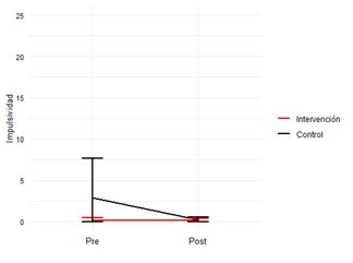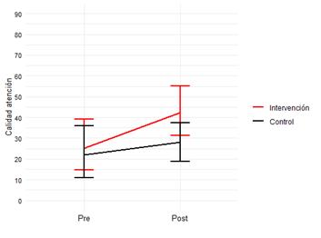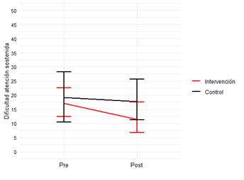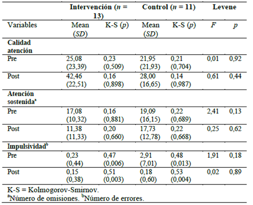 Las pruebas t de Student para muestras independientes y U de Mann-Whitney confirmaron la ausencia de diferencias previas a la intervención entre los dos grupos en calidad de la atención (t(22) = 0,34, 95% IC = -16,19 - 22,44, p = 0,741), atención sostenida (t(22) = -0,37, 95% IC = -13,31 - 9,28, p = 0,715), e impulsividad (U = 72, p = 0,967).