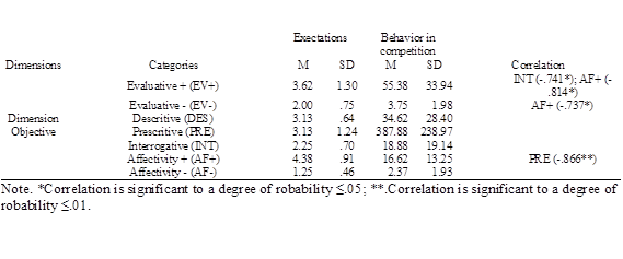 The results presented are related to the behavior of instruction, behavior of athletes and expectations of coaches. Each table of results is relative to the different dimensions of analysis. Tables included correlations between the expectations in the category/subcategory and between the categories/subcategories for a level of significance p≤0.05 and p≤0.01.