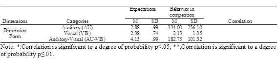 The expectations of the coaches, as to the form of instruction, was to emit more auditory-visual information (AU-VIS) (M=4.13, SD=.99), however, during the competition the information emitted is fundamentally auditory (AU) (M=334, SD=236.1).