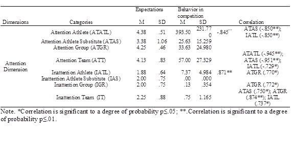 Coaches had few expectations regarding the inattention of athletes (IATL) and group of athletes (IGR) (defenses, midfielders, forwards and substitutes) and competition there were also low values for the category attention group (ATGR) (.770, p≤.05; .772, p≤.05). The Low values for the category attention group (ATGR), due to the little instruction directed at sectors of team and group of substitutes. This situation is also observed in significant correlations between the low expectations on the team inattention (IT) and the behavior of athletes in competition in the categories attention athlete substitute (ATAS) (.750, p≤.05), attention group (ATGR) (.874, p≤.01) and inattention athlete (IATL) (.737, p≤.05). The remaining negative correlations observed are due to coaches’ high expectations on team attention (ATT), and to the low values recorded for the categories attention athlete substitute (ATAS) (-.951, p≤.01) and inattention athlete (IATL) (-.729, p≤0.01). The inverse correlation between the expectations of the category attention team (ATT) and the behavior of athletes in competition (-0.945; p≤.01) was due to the high values registered in athlete attention category (ATATL).