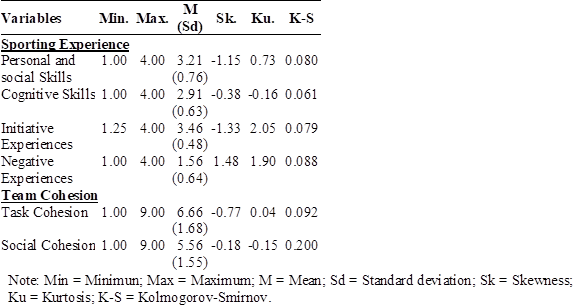 Data analysis was conducted through descriptive and inferential statistics. Independent sample t-test was used to test sex differences in team cohesion and sporting experience. The effect size (d) was also calculated using the model proposed by Cohen (1991), or differences in the values of two independent groups. According to Cohen's criteria, a value up to d = 0.30 represents small effect size; d = 0.50, medium; and d = 0.80, large. Pearson Correlation was used to investigate the relationship between team cohesion and sporting experience of student-athletes. Multiple Regression Analysis was used to determine whether the sporting experience might predict the perception of team cohesion. Two models were conducted using the backward method to enter the variables (removal criterion F=0.10) to investigate the prediction of sporting experiences dimensions (Personal Skills, Cognitive Skills, Initiative Experiences and Negative Experiences) (independent variables) on scores of team cohesion (dependent variable): Task Cohesion (Model 1); and Social Cohesion (Model 2). All independent variables were included together in the model in the same block. Data was screened to ensure that assumptions of normality, linearity, multicollinearity, and homogeneity of variance-covariance matrices were met (Tabachnick & Fidell, 2001). Data showed normal distribution and variances were equal. There were no sufficiently strong correlations between variables that indicate problems with multicollinearity (Variance Inflation Factors <5.0). All analysis were performed at SPSS v.22.0.