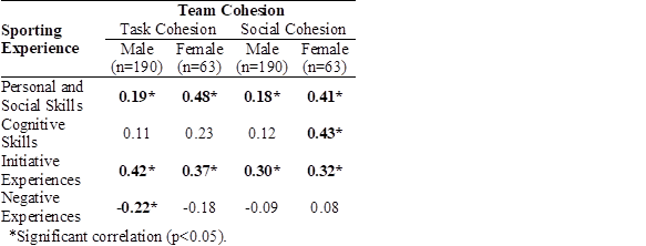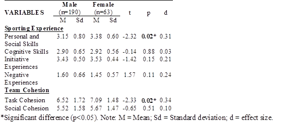 Pearson Correlation Analysis (Table 3) indicated the following significant correlations (p<0.05) for male athletes: Task Cohesion with Personal Skills (r=0.19), Initiative Experiences (r=0.42) and Negative Experiences (r=-0.22); Social Cohesion with Personal and Social Skills (r=0.18) and Initiative Experiences (=0.30). For female athletes, it was found the following significant correlations (p<0.05): Task Cohesion with Per Personal and Social Skills (r=0.48) and Initiative Experiences (r=0.37); Social Cohesion with Personal and Social Skills (r=0.41), Cognitive Skills (r=0.43) and Initiative Experiences (=0.32).