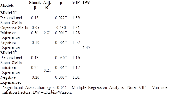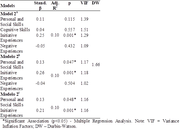 Results revealed that Model 2c showed greater percentage explanation of Social Cohesion (Table 5). Personal and Social Skills and Initiative Experiences (R=0.33; R2=0.10; F=7.440; p<0.01) were significant predictors of Social Cohesion, explaining 10% of its variance. The relationship of Personal and Social Skills (β=0.13; p=0.05) and Initiative Experiences (β=0.21; p<0.01) with Social Cohesion was positive and weak.