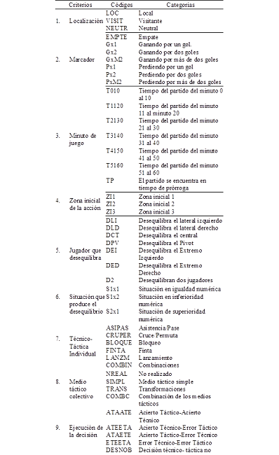El primer criterio hace referencia a la localización; escenario donde se desarrolla el partido. El marcador es el criterio que se corresponde a la suma numérica de goles de cada equipo, la categoría empate (EMPTE) se propone para el marcador igualado en goles y en el inicio del partido. El minuto de juego corresponde a la franjas de tiempo del partido en que se produce el ataque, y se presentan en siete categorías que van de diez en diez minutos hasta el minuto 60 del partido, además se decidió incorporar la categoría tiempo prórroga (TP). El criterio zona inicial de la acción se refiere a las zonas donde se producen las acciones de desequilibrio. (ZI1) es el área izquierda del terreno del equipo contrario, (ZI2) es la zona central del terreno determinada por los tres metros del ancho de la portería, y (ZI3) es la zona derecha del terreno del equipo contrario.