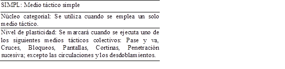 La acción técnico-táctica individual es la acción motriz que utiliza el jugador que produce el desequilibrio para desencadenar la jugada observada. El criterio medio táctico colectivo es la acción colectiva que emplea el equipo observado para conseguir un gol o un éxito relativo, la categoría NREAL se utiliza cuando la acción iniciada es detenida por un oficial del partido, o cuando ocurrido el desequilibrio la acción finaliza sin la ejecución de ningún medio táctico colectivo. La categoría SIMPL se emplea para señalar que se ha realizado una de las siguientes acciones: el pase y va, cruce, bloqueo, pantalla, cortina y penetración sucesiva; excepto las circulaciones y los desdoblamientos. La categoría TRANS se emplea para la ocurrencia de circulación y desdoblamientos, y la categoría COMBC se utiliza en la ocurrencia de dos o más medios tácticos, exceptuando las circulaciones o desdoblamientos.