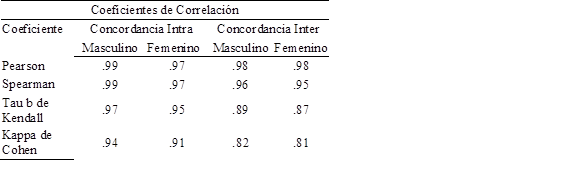 El análisis de la Calidad del Dato se realizó desde un punto de vista cuantitativo obteniendo los coeficientes de correlación Pearson, Spearman y Tau b de Kendall, y el índice de concordancia Kappa de Cohen para ambos sexos (Tabla 3).