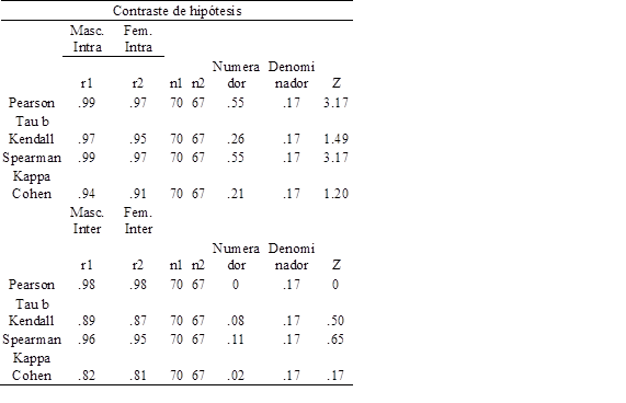 Para la determinación de la fiabilidad intraobservador se ha tomado el mismo diseño. Los resultados indican que la varianza queda asociada a la faceta Categorías con 99.91%, siendo 0 para la faceta Observadores y de 0.08% para la interacción de las facetas (Categorías/Observadores). El coeficiente de generalizabilidad relativo es 1.00 y el coeficiente de generalizabilidad absoluto es 1.00.