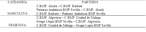 De los 24 equipos que participaron en la Copa de España sénior de 2016 se seleccionaron tres equipos, de forma aleatoria en cada categoría, y se observaron los partidos en lo que interaccionaban entre ellos resultando, un total de 12 sesiones de observación, seis para la categoría masculina y seis para la categoría femenina. A partir de 5 sesiones de observación se ha considerado el número mínimo de sesiones estimado para generalizar con precisión (Vázquez-Diz et al., 2019a). Los partidos analizados se muestran en la tabla 1.