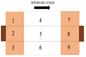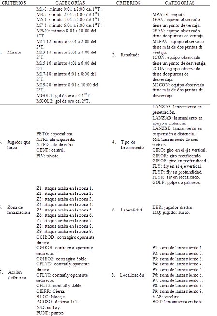 La herramienta de observación usada en esta investigación ha sido creada y diseñada ad hoc (Vázquez-Diz et al., 2019a) y ha pasado las pruebas de calidad del dato exigibles en MO (Morillo-Baro y Hernández-Mendo, 2015). Está construida mediante un sistema mixto de formato de campo y sistemas de categorías, exhaustivas y mutuamente excluyentes (E/ME). La herramienta está formada por 11 criterios y 85 categorías que se corresponden con el desarrollo cronológico de un ataque (Morillo-Baro y Hernández-Mendo, 2015). En la tabla 2 se puede observar la composición de la herramienta de observación.