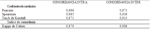 Como se puede observar, el índice de Kappa de Cohen para esta investigación supera el 0,900 tanto para la fiabilidad intraobservador (0,979) como para la interobservador (0,906). Debido a estos resultados, se considera que existe una alta fiabilidad, según los valores propuestos por Gelfand y Hartmamm (1975) o Landis y Koch (1977).
