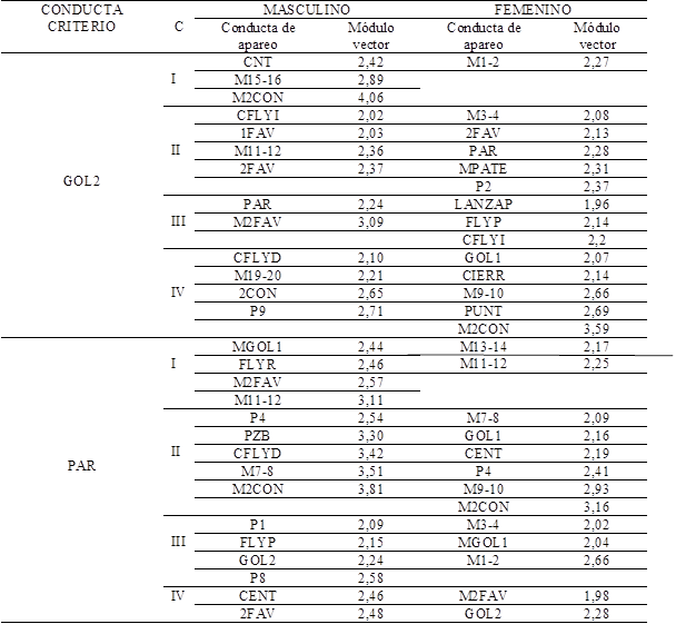Los resultados muestran que cuando la conducta criterio es GOL2, en el cuadrante I, donde la conducta focal excita, tanto en perspectiva prospectiva como retrospectiva, a la de apareo, en categoría masculina se asocia con tres conductas de apareo, siendo la del resultado de más de dos goles en contra (M2CON) la que mayor intensidad en la relación presenta. En categoría femenina, se asocia tan solo con una. Mientras, para la conducta PAR, aparecen cuatro conductas en categoría masculina y solo dos en femenina.