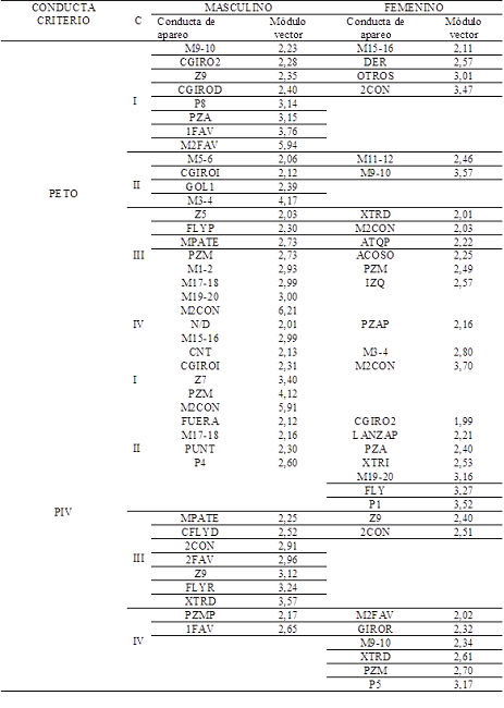 A continuación, en la tabla 6 se muestran los resultados obtenidos para las conductas criterio PETO (especialista) y PIV (pivote), que pertenecen al criterio Jugador que lanza.