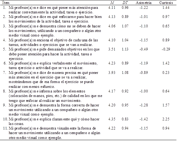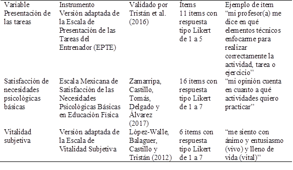 Las fiabilidades de los instrumentos han sido probadas en estudios previos. En el caso del EPTE, el estudio de Garza-Adame et al. (2017) ha comprobado su fiabilidad en el contexto deportivo, obteniendo un coeficiente alpha de Cronbach de .93. En este estudio, la fiabilidad de la escala evaluada mediante el coeficiente alpha de Cronbach fue de .83, resultando por tanto satisfactoria. En la tabla 2 se presenta la versión adaptada al contexto de la educación física de esta escala así como sus estadísticos descriptivos. La fiabilidad de la Escala Mexicana de Satisfacción de las Necesidades Psicológicas Básicas fue comprobada por sus autores (Zamarripa et al., 2017) y confirmada en este estudio, obteniendo un valor alpha de Cronbach de .85. En el caso de la vitalidad subjetiva (indicador del bienestar psicológico) la fiabilidad de la Escala de Vitalidad Subjetiva ha sido confirmada en el contexto deportivo (Garza-Adame et al., 2017), en los datos de este estudio, el alpha de Cronbach de la escala fue de .78, resultando por tanto satisfactoria.