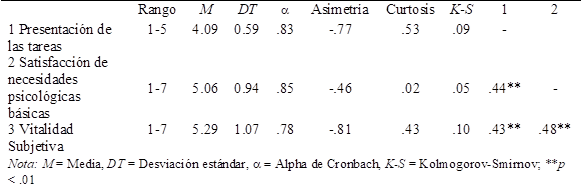 En la tabla 3 se presentan los estadísticos descriptivos de las variables del estudio, los cuales indican que los valores obtenidos se encuentran dentro de los parámetros de normalidad. De acuerdo con la prueba de Kolmogorov-Smirnov los resultados en todas las variables de estudio no fueron significativos (p > .05), lo que confirma una distribución normal de los datos. Los coeficientes de fiabilidad de todas las escalas fueron satisfactorios (entre .78 y .85), estando por encima del criterio de .70 establecido por Peterson (1994). En el análisis de interrelación entre las variables de estudio se aprecia una interrelación positiva y significativa entre todas ellas. La presentación de las tareas por parte del entrenador presentó una correlación positiva y significativa con las necesidades psicológicas básicas en su conjunto