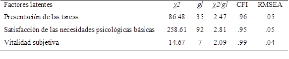Se realizaron análisis descriptivos de cada una de las variables del estudio (rango, media, desviación típica, curtosis y asimetría), y se realizó la prueba de Kolmogorov-Smirnov con el propósito de evaluar la normalidad de los datos. Se utilizó la correlación de Pearson para analizar las interrelaciones entre las variables del modelo y establecer el grado de asociación entre ellas. Los análisis descriptivos y correlacionales se realizaron mediante el software estadístico SPSS 24.0. También se llevaron a cabo análisis factoriales confirmatorios (AFCs) con el objetivo evaluar la estructura factorial de las escalas utilizadas en el estudio. Finalmente, para poner a prueba el modelo de mediación hipotetizado (figura 1), se realizó un análisis de ecuaciones estructurales (SEM). Se utilizó el software AMOS 24.0 en la realización de los AFCs y la evaluación del modelo hipotetizado mediante SEM. En ambos análisis, se tomaron en cuenta los siguientes índices de bondad de ajuste: ji-cuadrado partido por grados de libertad, el índice de ajuste comparativo (CFI, Comparative Fit Index) y la raíz del promedio del error de aproximación (RMSEA, Root mean Square Error of Aproximation) (Bentler, 1990; Bentler y Bonett, 1980; Hu y Bentler, 1995; Steigner y Lind, 1980; Wheaton, Muthén, Alwin y Summers, 1977). Se utilizaron los siguientes criterios para valorar el ajuste de los modelos: un cociente χ2/gl menor a 3 es indicador de ajuste satisfactorio (Carmines y McIver, 1981); para CFI valores superiores a .90 indican un ajuste aceptable (Hu y Bentler, 1995); en el caso de la RMSEA, valores inferiores a .08 indican un error razonable, mientras que valores superiores .10 no son admisibles (Browne y Cudeck, 1993). Para finalizar, en la evaluación del efecto de mediación o efecto indirecto puesto a prueba en el modelo, se utilizó el método bootstrap estimando un intervalo de confianza corregido de sesgo (bias-corrected boostrap confidence interval method; MacKinnon, Lockwood, y William, 2004; William y MacKinnon, 2008). Este método implica el cálculo del producto de los coeficientes de regresión que estiman el efecto indirecto (b1b2), donde b1 es el coeficiente que estima la relación entre la presentación de las tareas por parte del profesor y la satisfacción de las NPB, y b2 es el coeficiente que estima la relación entre la satisfacción de las NPB y la vitalidad subjetiva. Posteriormente, se obtiene el intervalo de confianza de bootstrap para el efecto indirecto (b1b2). Si el intervalo de confianza no incluye el valor cero, se obtiene evidencia empírica del efecto indirecto (es decir, del efecto de mediación). En cuanto a los criterios para interpretar los índices de ajuste incremental, Cheung y Rensvold (2002) sugieren que una diferencia de .01 o menos, entre los valores de CFI (ΔCFI< .01) indica diferencias prácticamente irrelevantes entre los modelos. De manera similar, Chen (2007) sugirió que los aumentos de RMSEA <.015 entre modelos alternativos indican diferencias irrelevantes y, por lo tanto, se debe seleccionar el modelo más parsimonioso.