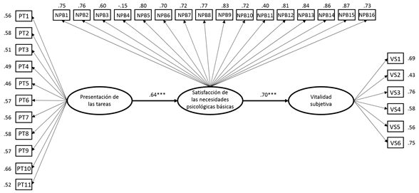 El modelo de mediación hipotetizado (ver figura 1) presentó índices de ajuste adecuados ((2(475) = 915.787, (2/gl = 1.928, CFI = .936, RMSEA = .042). En la figura 2 se presenta la solución estandarizada del modelo estructural. De acuerdo con los resultados obtenidos la presentación de las tareas por parte del profesor de educación física resultó ser un predictor positivo y significativo de la satisfacción de las necesidades psicológicas básicas en su conjunto (β1= .64, p < .001) y estás, a su vez, fueron predictoras de la vitalidad subjetiva (β2= .70, p < .001), que es indicador del bienestar psicológico de los alumnos de educación física. Además, el intervalo de confianza (IC) estimado por bootstrap para el efecto indirecto no incluyó el valor cero (b1b2 = .39; IC 95% = [.168, .649]), por lo que podemos concluir que la satisfacción de las NPB medió la relación entre la presentación de las tareas por parte del profesor y la vitalidad subjetiva.