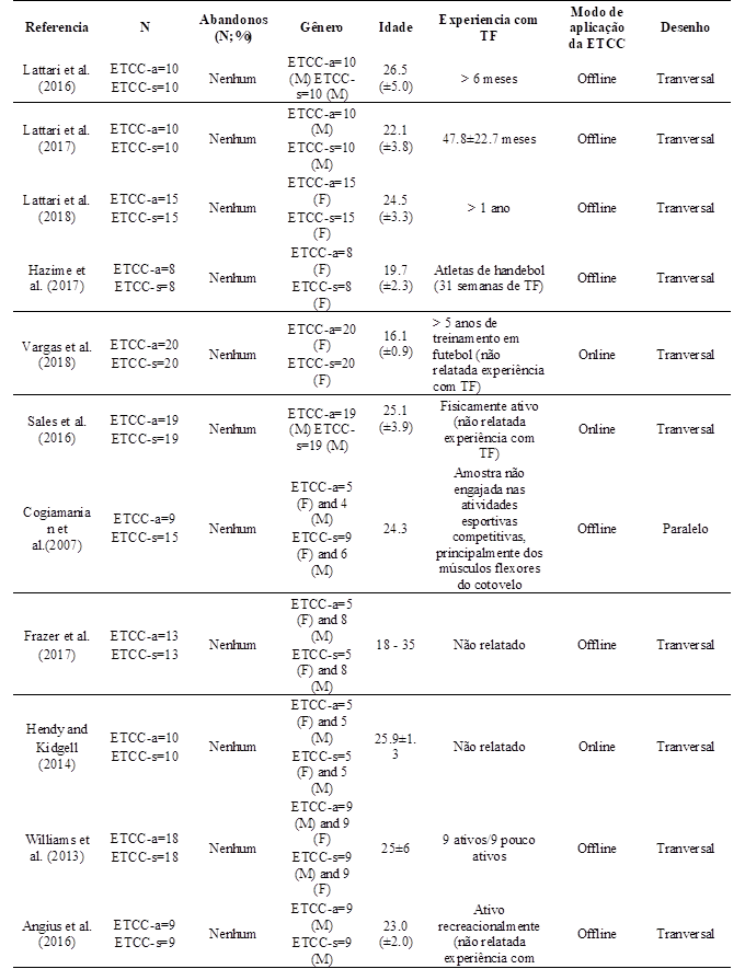 Com relação às condições de controle, apenas um estudo aplicou nenhum estímulo placebo (Cogiamanian et al., 2007) e os outros utilizaram a ETCC-s (Lattari et al., 2016; Lattari et al., 2017; Hazime et al., 2017; Vargas et al., 2018; Sales et al., 2016; Frazer et al., 2017; Hendy and Kidgell, 2014; Williams et al., 2013; Angius et al., 2016; Kan et al., 2013; Abdelmoula et al., 2016; Tanaka et al., 2009; Montenegro et al., 2015; Flood et al., 2017; Ciccone et al., 2018; Radel et al., 2017).