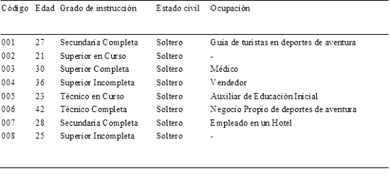 Los informantes claves estaban conformados por un grupo de 8 deportistas extremos entre 21 y 42 años, que practican puenting, trekking y rapel. Todos los informantes son solteros y su grado de instrucción va desde secundaria completa hasta superior completa. Se realizaron varios encuentros, con los informantes. Observando y conversando con cada uno a la vez.