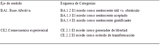 Asimismo, se pudo identificar que la emoción primaria experimentada por los informantes es el miedo. Por lo tanto, la información fue ordenada en las siguientes categorías: el miedo como generador de libertad, el miedo como sentimiento útil vs obstáculo, el miedo como sentimiento aceptado, el miedo como sentimiento gratificante y el miedo como método de transformación. Estos discursos se desencadenan del sistema de categorías de la tabla 2.