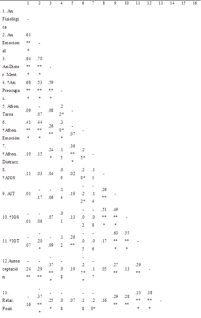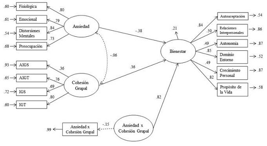 En primer lugar, se calculó la matriz de correlaciones entre todas las variables del estudio. Los resultados se detallan en la Tabla 1. Tal como se puede observar, en líneas generales tanto las variables de ansiedad como las de afrontamiento y las de cohesión de grupo correlacionaron con las de bienestar significativamente. Por otro lado, las variables de ansiedad fueron mayoritariamente independientes de las de cohesión de grupo (relaciones no significativas), mientras que en el caso de las variables de afrontamiento mostraron correlaciones positivas y significativas con el subtipo afrontamiento hacia la emoción. Finalmente, las variables de cohesión y de afrontamiento fueron mayoritariamente independientes (relaciones no significativas).