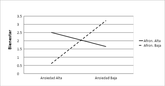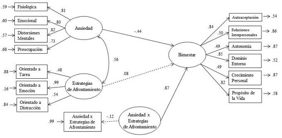 Crecimiento personal (t = -1.17, p = .246), y Propósito en la vida (t = 1.57, p = .119). De esta manera, se analizó el efecto moderador de las estrategias de afrontamiento, de manera que el modelo resultante alcanzó un ajuste global satisfactorio según todos los índices valorados: χ2 / gl = 1.30, RMSEA = .055 (I.C. 90%: .004 - .085), CFI = .95, NNFI = .93. Los resultados del modelo global se pueden observar en la Figura 1. Tal como se puede observar, aunque las estrategias de afrontamiento no estuvieron significativamente asociadas con el bienestar, el término de interacción creado a partir de las variables de ansiedad y de las variables de estrategias de afrontamiento estuvo relacionado significativamente con el factor latente correspondiente al bienestar. Esto demuestra la existencia de un efecto significativo de moderación. De esta forma, para analizar los efectos condicionales de esta moderación se representaron gráficamente los efectos. Los resultados se detallan en la Figura 2. Tal como se puede observar, los casos que presentaban un nivel alto de afrontamiento, presentaban niveles muy similares de bienestar independientemente del nivel de ansiedad. Por el contrario, los deportistas con un nivel bajo de estrategias de afrontamiento presentaron niveles sensiblemente más bajos de bienestar cuando también se daban niveles altos de ansiedad que cuando éstos eran bajos.