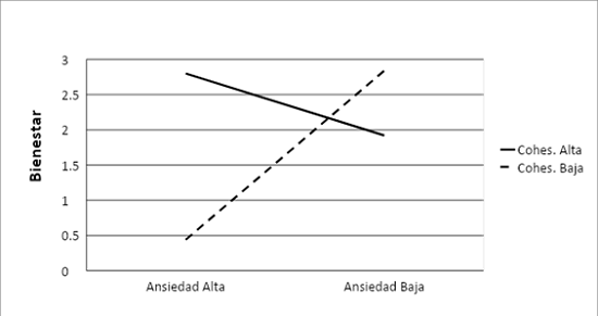 Seguidamente se llevó a cabo el segundo modelo de moderación. Analizando el efecto de la cohesión de grupo. En este caso el modelo mostró igualmente un ajuste satisfactorio a los datos: χ2 / gl = 1.26, RMSEA = .052 (I.C. 90%: .000 - .080), CFI = .95, NNFI = .94. Los resultados del modelo se detallan en la Figura 3. Tal como se puede observar, tanto el factor latente correspondiente a la variable independiente (ansiedad) como el factor latente correspondiente a la variable moderadora (cohesión grupal) estuvieron significativamente relacionadas con el factor latente correspondiente a la variable dependiente (bienestar). Además, el término de interacción obtuvo una relación significativa con este último, mostrando un efecto significativo de moderación. Al igual que en el anterior caso, para analizar los efectos condicionales de esta moderación se representaron gráficamente los efectos. Los resultados se detallan en la Figura 4. Tal como se puede observar, los casos que presentaban un nivel alto de cohesión grupal, presentaban niveles muy similares de bienestar independientemente del nivel de ansiedad. Por el contrario, los deportistas con un nivel bajo de cohesión grupal presentaron niveles sensiblemente más bajos de bienestar cuando también se daban niveles altos de ansiedad que cuando éstos eran bajos.