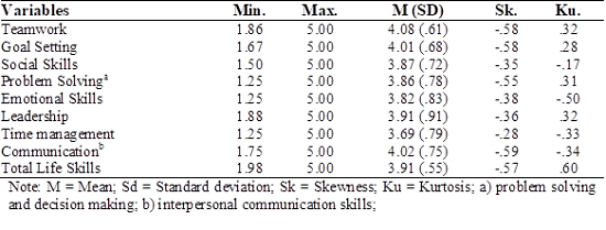 The results presented in Table 1 show that the values reported on the perception of the life skills development ranged from 1.25 to 5, and the values of the skewness and kurtosis ranged between -.35 and .60, respectively. The mean scores on the 1-5 response scale of the LSSS revealed that players perceived they were developing their life skills through sports. The mean scores from highest to lowest were as follows: Teamwork (M=4.08, SD=.61), Communication (M=4.02, SD=.75), goal setting (M=4.01, SD=.68), leadership (M=3.91, SD=.91), social skill (M=3.87, .72), problem solving (M=3.86, SD=.78), emotional skill (M=3.82, SD=.83), time management (M= 3.69, SD=.79). Based on these scores and the total life skills score (M = 3.91, SD = .55).