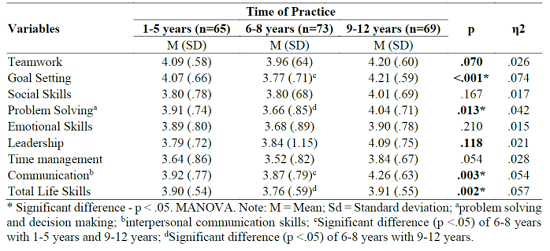 When comparing the life skills subscales of the Brazilian youth futsal practitioners according to the time of practice (Table 3), there was significant difference between groups in problem solving (p=.013), communication (p=.003) and total score of life skills (p=.002). As shown in Table 3, more experienced adolescents presented higher scores at these dimensions and in the total score of life skills when compared to less experienced adolescents. This effect can be considered large (η2>.13).
