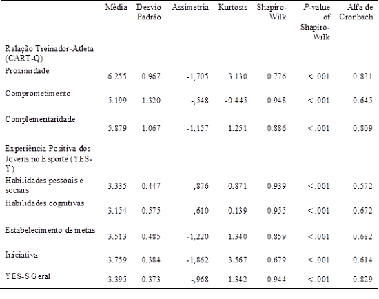 Foram utilizados os questionários Relacionamento Treinador-Atleta (CART-Q Atleta) (Vieira et al., 2015b) e Experiência Positiva dos Jovens no Esporte (YES-Y) (Rigoni, 2014), ambos adaptados e validados para a língua portuguesa. O questionário CART-Q Atleta (Vieira et al., 2015b), em Escala Likert, tem 11 itens que representam as dimensões de proximidade (α= .83), comprometimento (α= .64) e complementaridade (α= .80). O questionário YES-Y utilizado foi adaptado para a língua portuguesa e validado por Rigoni (2014), a partir da versão de MacDonald et al. (2012), sendo composto por 18 itens que representam as dimensões de habilidades pessoais e sociais (α= .57), habilidades cognitivas (α= .67), estabelecimento de metas (α= .68) e iniciativa (α= .61), e a dimensão maior, YES-Y Geral (α= .82). A consistência interna dos questionários apresentou indicador de confiabilidade aceitável.