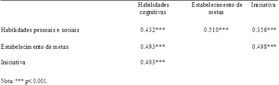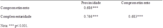 De acordo com os resultados na Tabela 2, podemos verificar que o coeficiente de correlação entre as dimensões do questionário CART-Q é forte (R>0.60) e positivo entre todos os pares de variáveis, indicando que efetivamente existe uma relação linear positiva entre estas dimensões e, portanto, quanto maior for o comprometimento na relação treinador-atleta, maior será a proximidade e a complementaridade. Já os resultados apresentados na Tabela 3, mostram que para as dimensões do questionário YES-Y, não existe uma correlação forte entre elas, embora seja significativa.